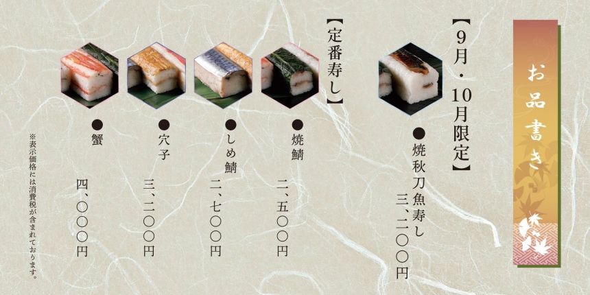 九月・十月は、秋の旬味を映す〈焼秋刀魚寿し〉が登場。