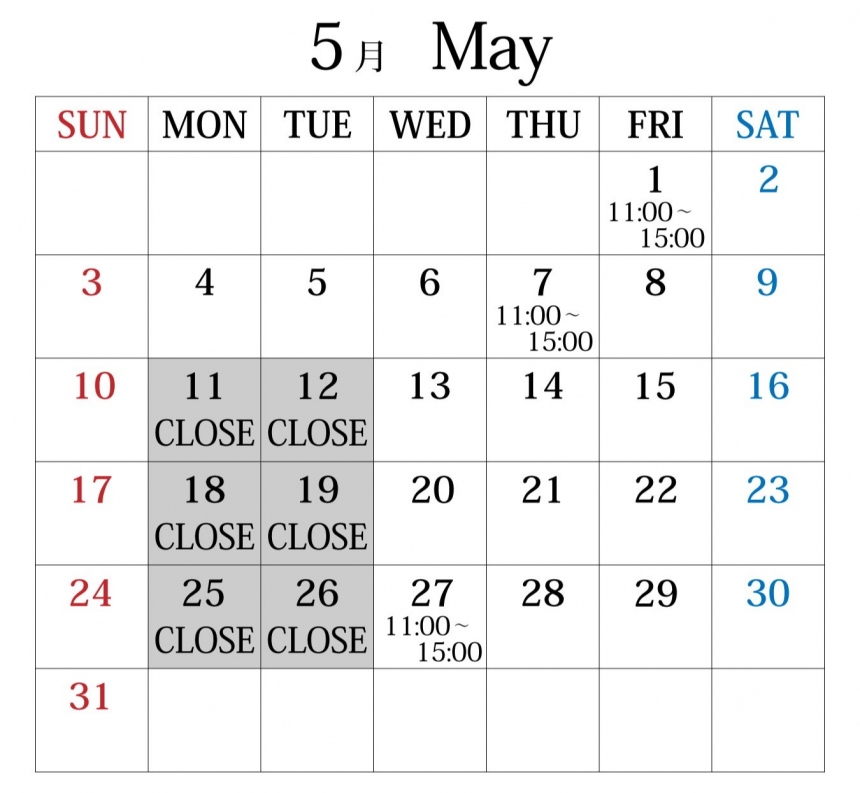 ※営業時間短縮日:5月1日・7日・27日(11:00~15:00)