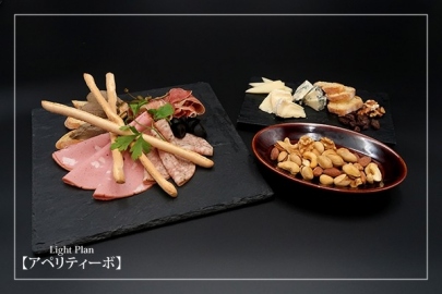 | Light Plan【アペリティーボ】 燻製ナッツ シェフ厳選 前菜アソート 香り豊かなチーズプレート 料金: 3,500円 (税込・サービス料込) |