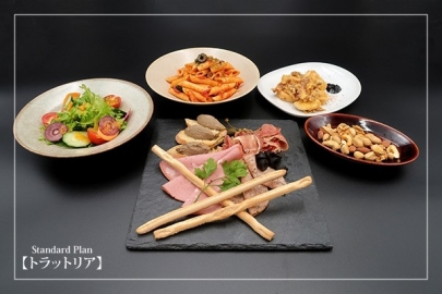 | Standard Plan【トラットリア】 契約農家の彩りサラダ シェフ厳選 前菜アソート カラマリのクリスピーフリット 本日のおすすめパスタ ~旬をのせて~ 料金: 4,300円 (税込・サービス料込) |